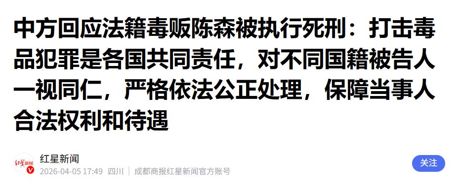 1.红星新闻-2026-04-05——《中方回应法籍毒贩陈森被执行死刑:打击毒品犯罪是各国共同责任,对不同国籍被告人一视同仁,严格依法公正处理,保障当事人合法权利和待遇》