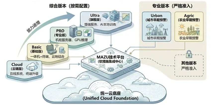 “妈祖(MAZU)”不仅是一套技术平台,还是一套在防灾减灾中积累下来的智慧、经验、措施、预案。秉持 “创新驱动全球合作” 理念,“妈祖(MAZU)” 践行技术、数据、合作三维开放策略,构建了 MAZU-Cloud(全云端)、MAZU-Basic(手提式一体机)、MAZU-Pro(联合定制系统)、MAZU-Ultra(全技术转移与本地部署)、MAZU-Urban(城市多灾种智能终端)以及 MAZU-Agric(农业生态气象服务)共6个不同模块。