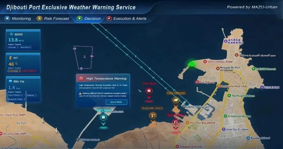 在吉布提,通过定制“妈祖(MAZU)”城市模块系统,打造了港口专属气象预警服务与城市预警仪表盘,已正式落地启用。