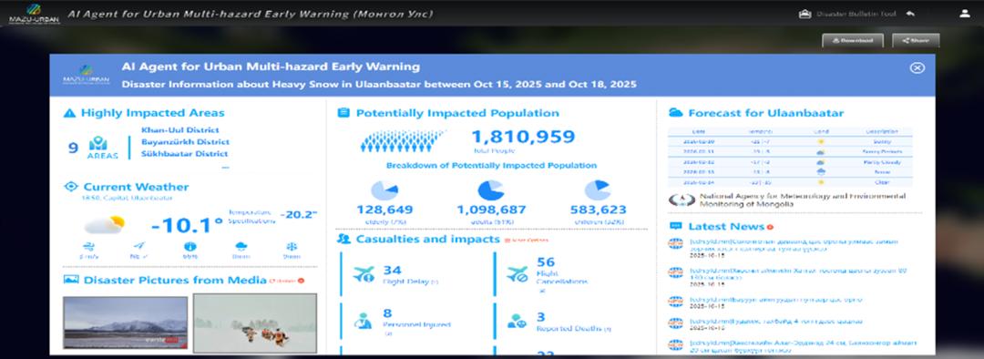 蒙古国应用的气象人工智能由上海市气象局牵头研发,名为“妈祖(MAZU)”城市多灾种早期预警智能体(MAZU—Urban)。智能体集成了风险评估、监测预报、信息传播、应急响应“四大支柱”工具。2025年10月,中方技术骨干配合蒙方完成智能体本地部署工作,并开展相关技术培训。最近,根据蒙古国航空气象服务、乌兰巴托城市内涝影响预报等需求,中蒙气象部门着手提升“工具箱”的普适性。
