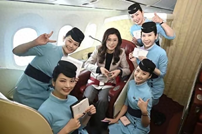 郑丽文和5位乘务员合影,签名拍照没有架子很随和,太幸福了!这应该是五位小姐姐最开心的一天。
