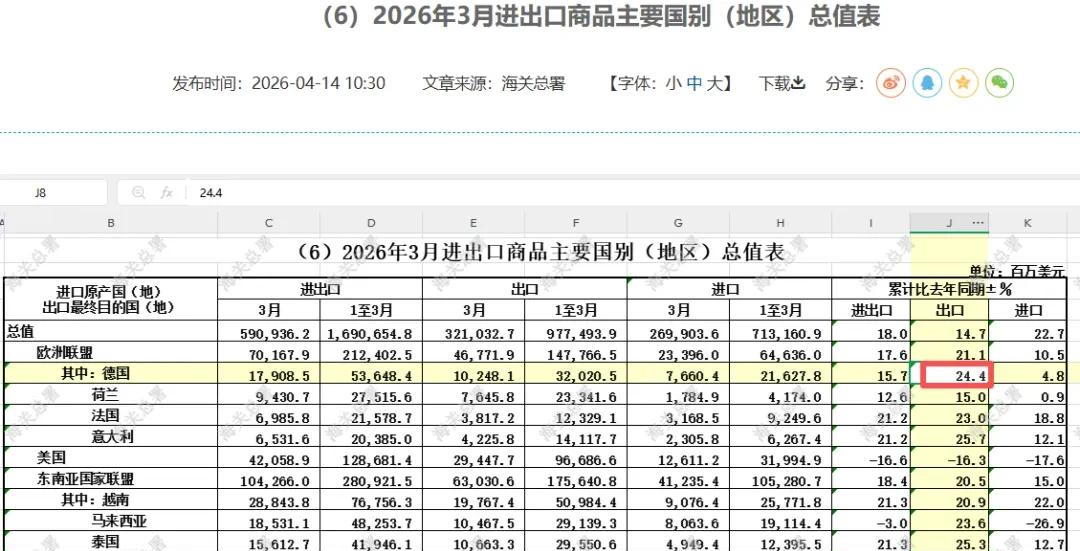 此外,一季度累计出口到德国的增幅达到24.4%。