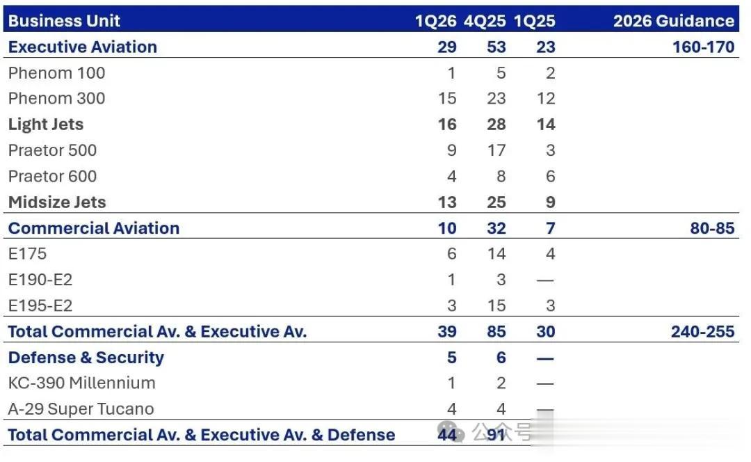 根据巴航工业的业绩指引,预计2026年商用飞机交付量为80至85架,公务机交付量为160至170架。