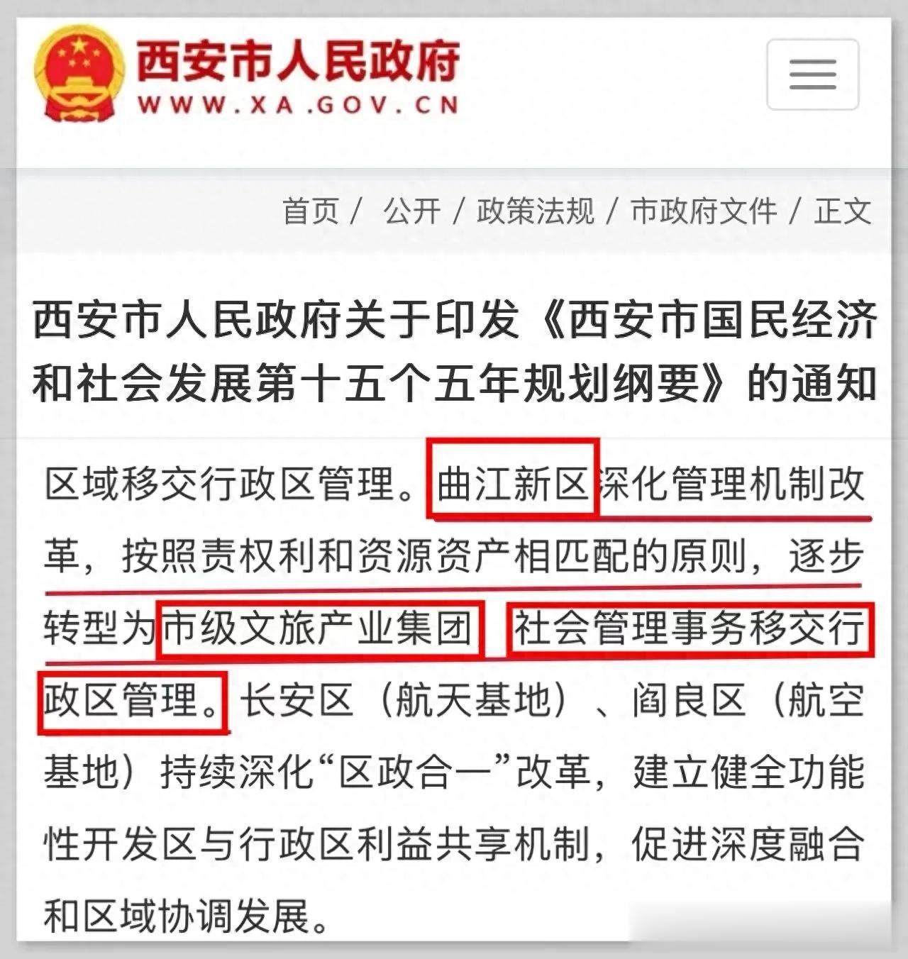 咱先把政策原文给大家念一遍,划重点:曲江新区要深化管理机制改革,按责权利和资源资产相匹配的原则,逐步转型为市级文旅产业集团,社会管理事务移交行政区管理!