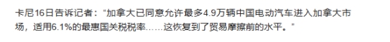02关税降至六点一整件事还得从今年1月份说起,那时候加拿大总理卡尼亲自来了一趟中国,当时就和中方谈成了一件大事,那就是降低中国产电动车的进口关税。