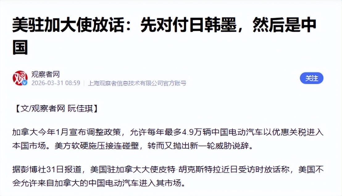 可以说正是因为把关税降到了6.1%,才让中国的新能源汽车技术和产品能顺畅地进入加拿大,也让两国在制造业上的合作有了实实在在的进展。