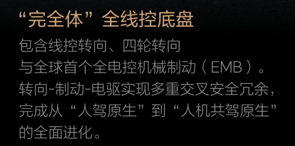 同时,车辆还配备了全线控底盘,集成线控转向、四轮转向以及全电控机械制动三大核心技术。值得关注的是,即便在极端情况下三个车轮同时失去制动,单轮制动也能实现刹停车辆,安全性有一定提升。此外,后轮转向系统的加入也使得转弯半径更加灵活,提升了城市路况下的操控便利性。
