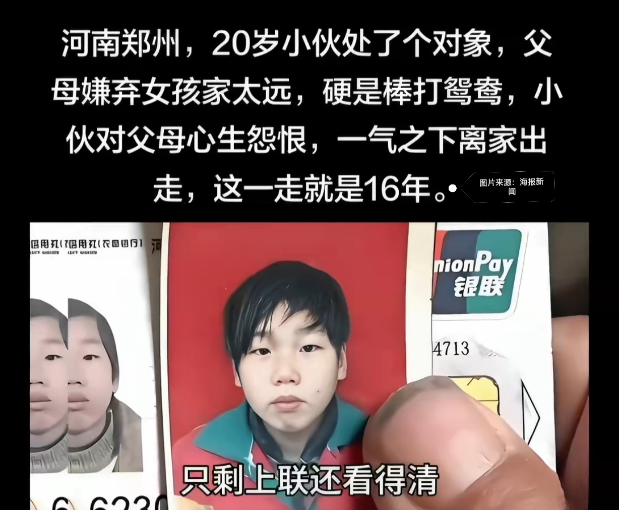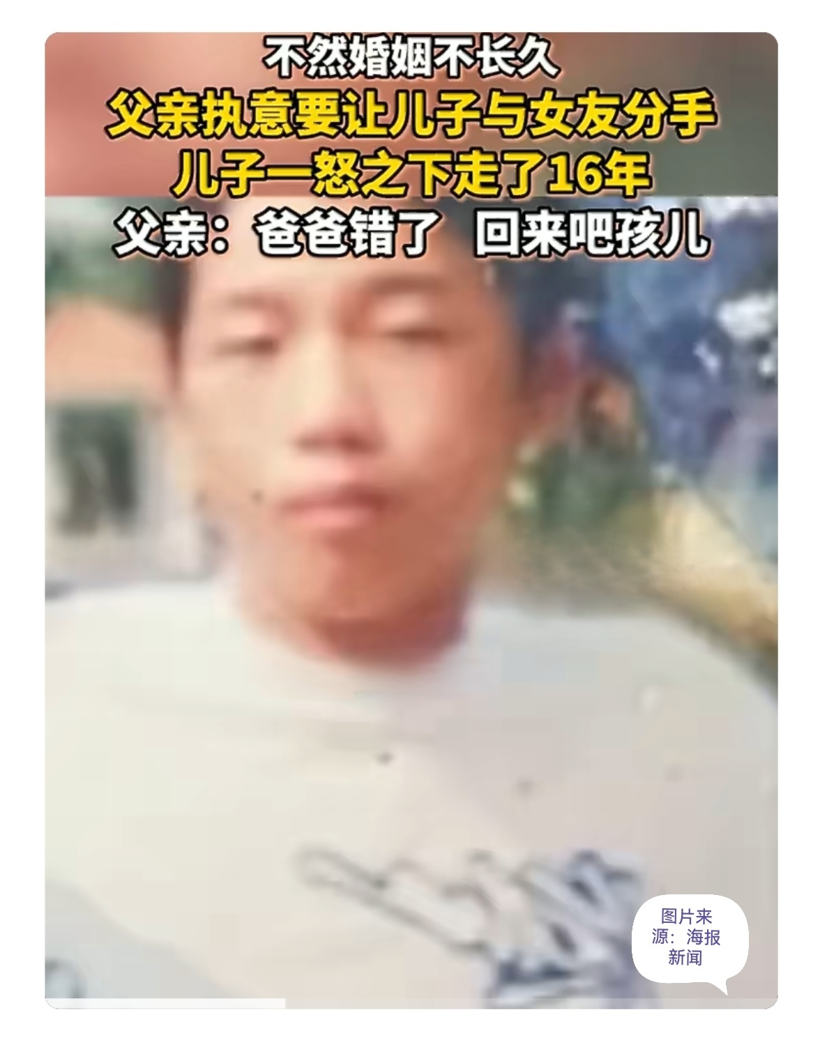 一段姻缘,16年分离,一辈子遗憾。希望这位儿子能看到消息,给父亲一个道歉的机会,也给自己一个回家的理由。
