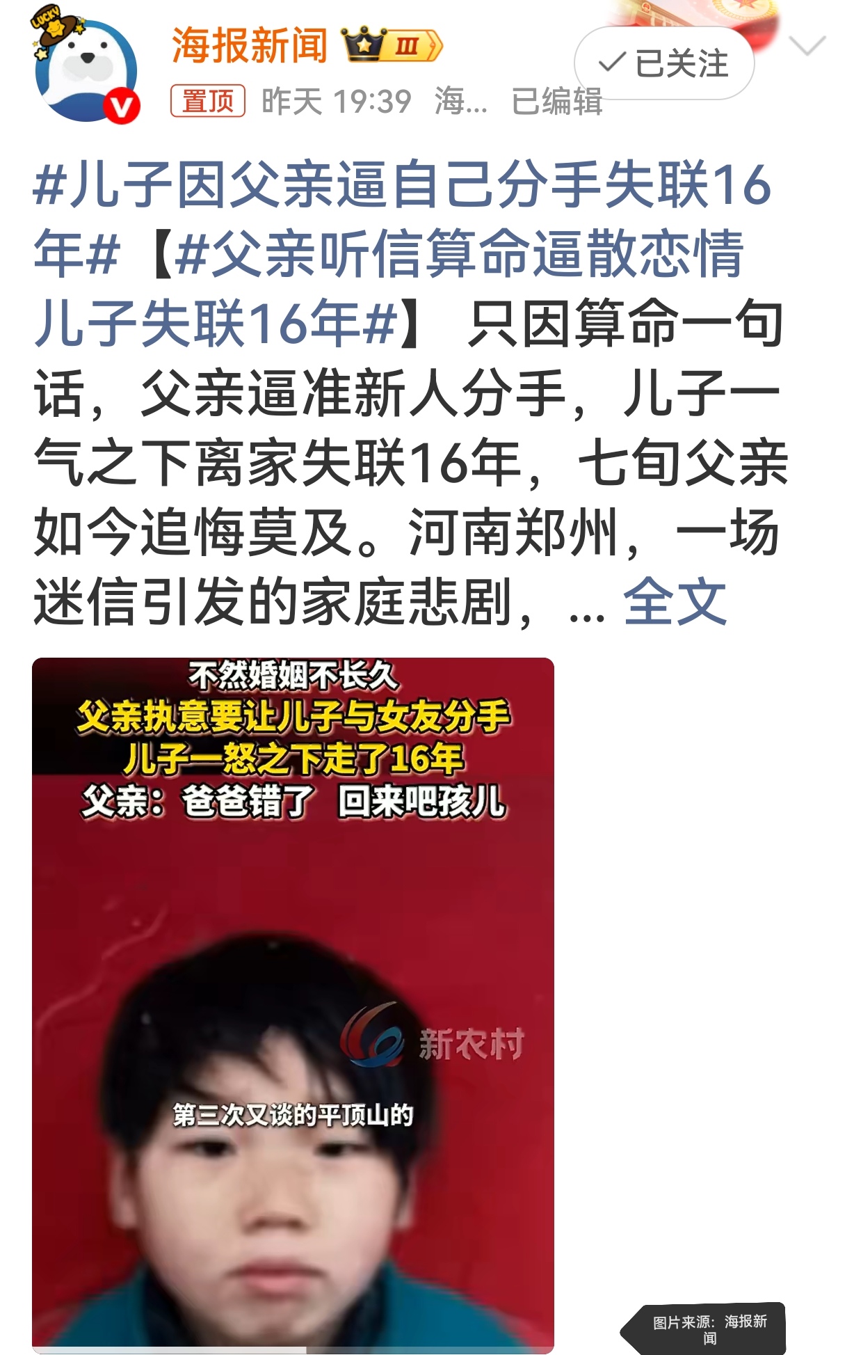 #儿子因父亲逼自己分手失联16年# #父亲听信算命逼散恋情儿子失联16年# #迷信毁了家庭#
