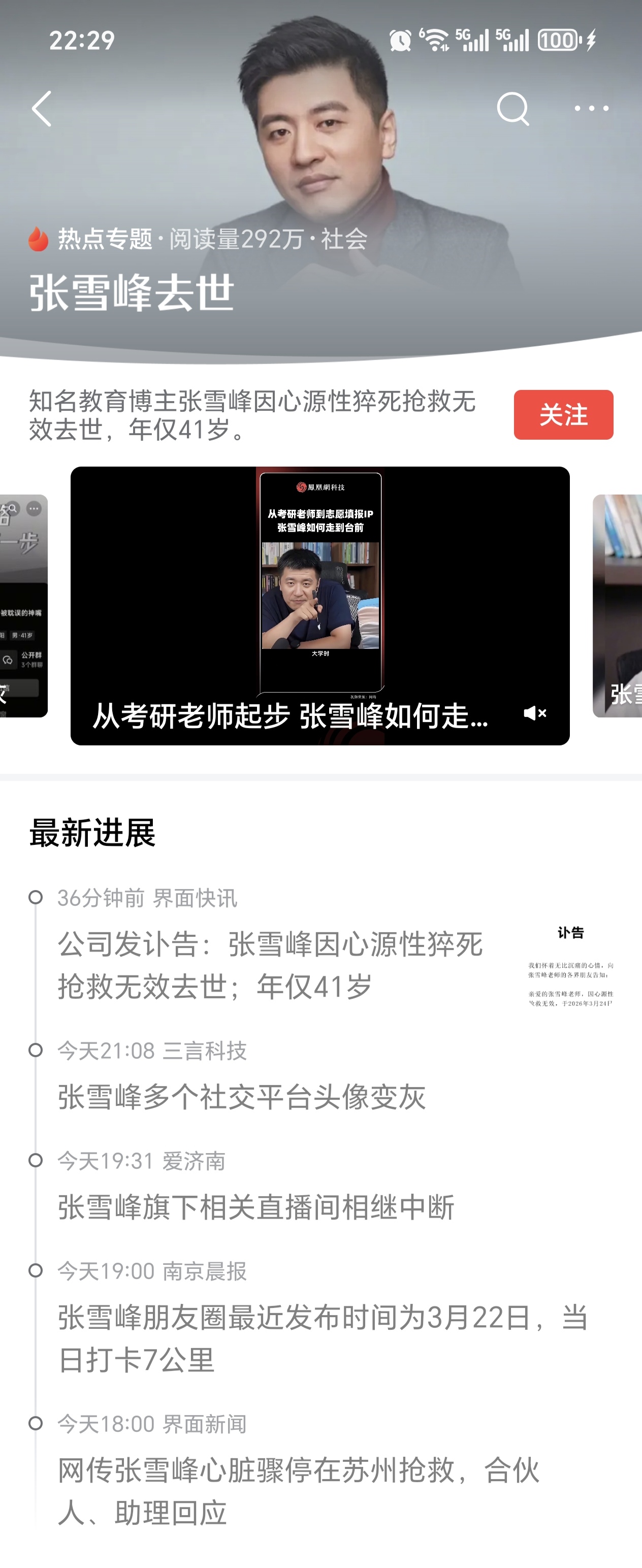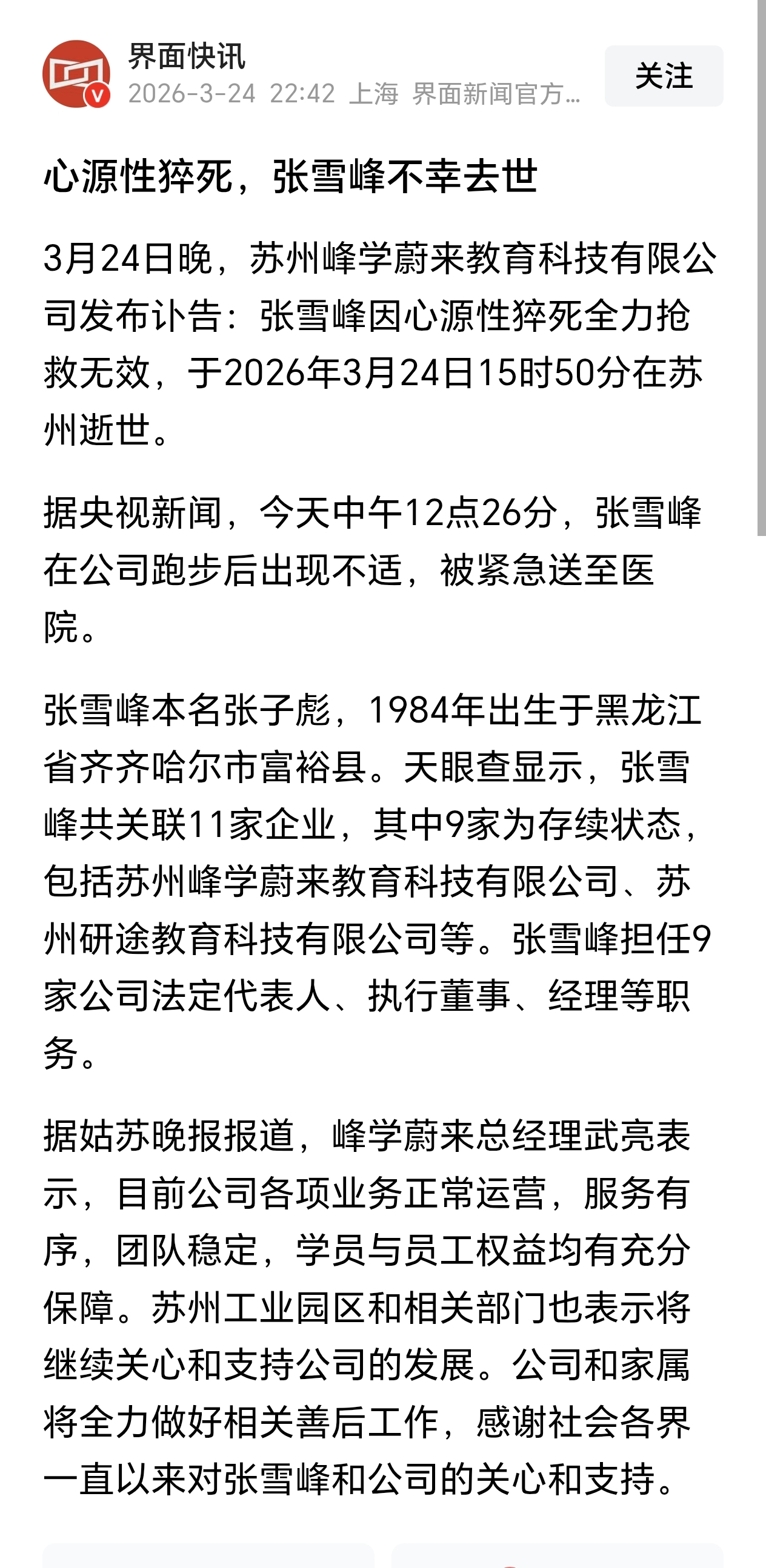 刚写到这里就又看到头条推送过来的一条最新消息,张雪峰去世前的病发抢救细节被披露:“在今天中午12点26分,张雪峰在公司跑步后出现不适,于是被紧急送至医院。”所以这个消息就验证了我上面的猜测,张雪峰这次突然病发还真的很大的可能就是因跑步强度太高引发的,所以有时高强度的运动未必就是好事情,还是要结合个人身体情况去安排才行。
