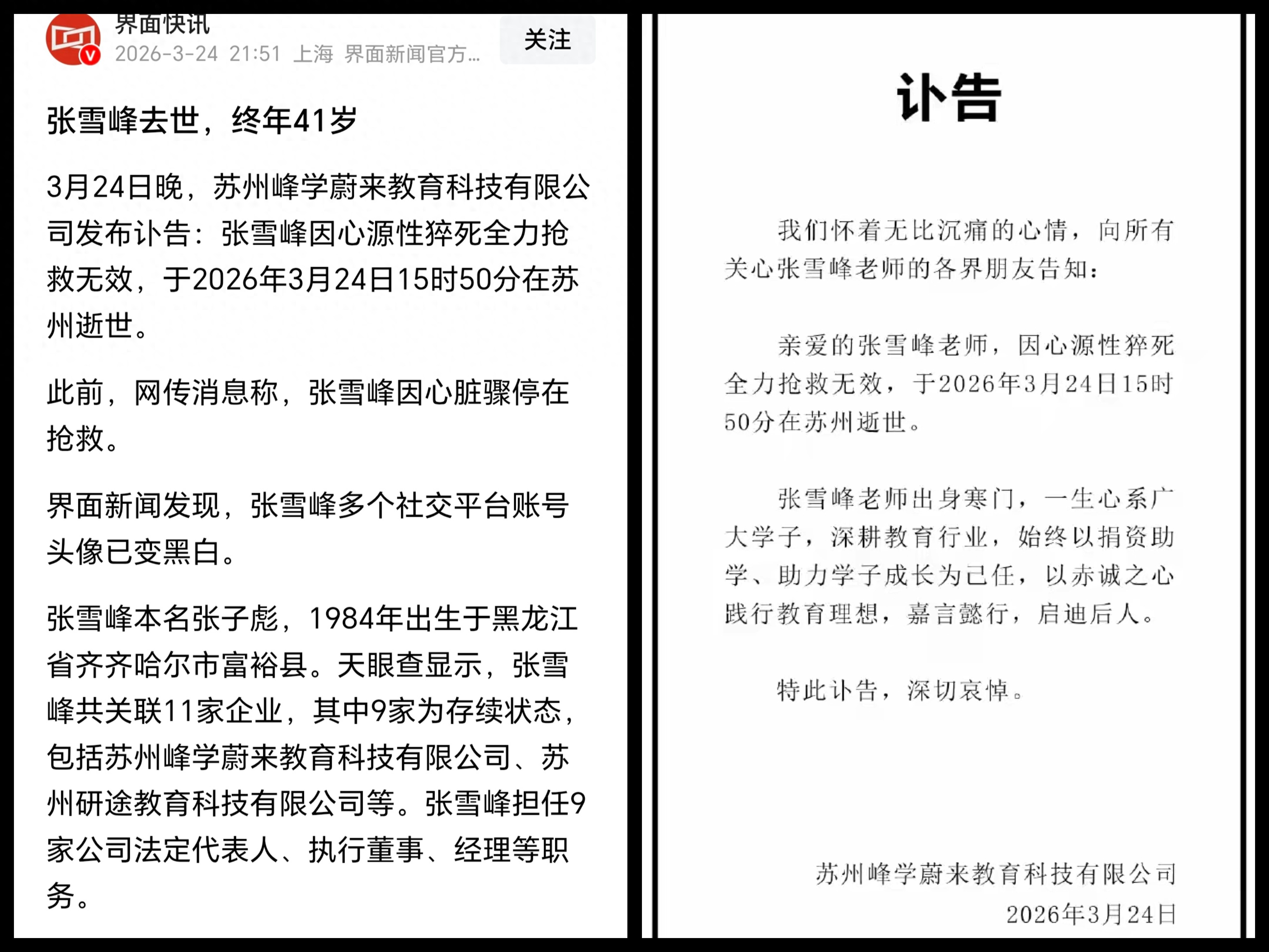 从这份“苏州峰学蔚来教育有限公司”发布的讣告中,大家可知张雪峰病发后因抢救无效离世的时间是今天下午的15时50分,也就是说当18点媒体曝出张雪峰因心脏骤停在苏州抢救的消息时,其实他就已经离世2个多小时了,只是公司人员没有第一时间透露这个令人心痛的消息,那病发时间应该是上午更多。