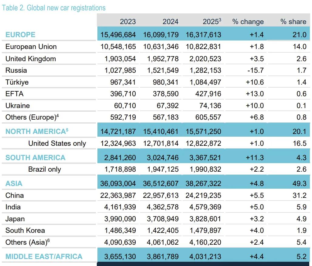 2025年全球汽车市场注册量(约等于销量)同比增长3.5%,达到7760万辆,总体呈现积极趋势,但各地区增长幅度不一。其中,中国汽车市场注册量同比增长了5.5%,这主要得益于报废补贴和新能源汽车政策的推动;北美汽车市场增长较为温和,同比增幅仅为1%,反映出经济环境的不确定性和波动性;欧洲汽车市场在年初表现低迷之后,整体注册量仍保持了1.4%的增长。