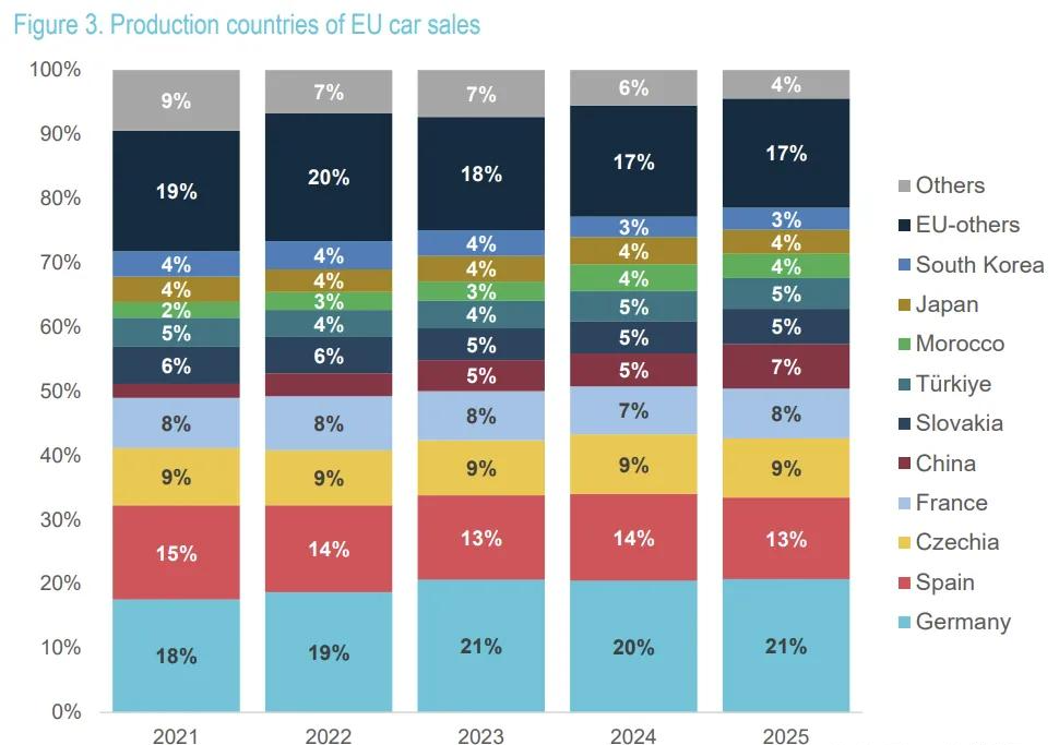 在中国汽车品牌迅速在欧洲市场扩张的同时,传统的亚洲其他国家的汽车品牌在欧洲市场却停滞不前,2025年韩国和日本的汽车品牌在欧洲的市场份额分别停滞在 3% 和 4%,已大幅落后于中国汽车品牌。