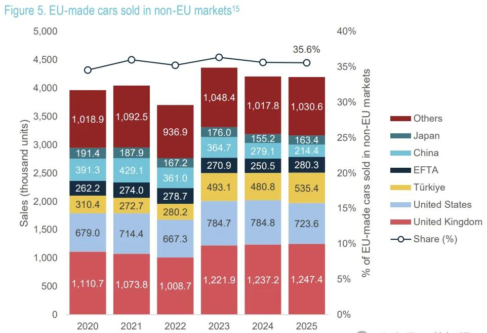尽管面临挑战,欧盟制造的汽车依然保持着强劲的国际需求,超过三分之一销往欧盟以外的国家。英国、美国和土耳其仍然是主要市场,但由于中国市场的竞争加剧,欧盟制造的汽车在中国的销量持续下滑。