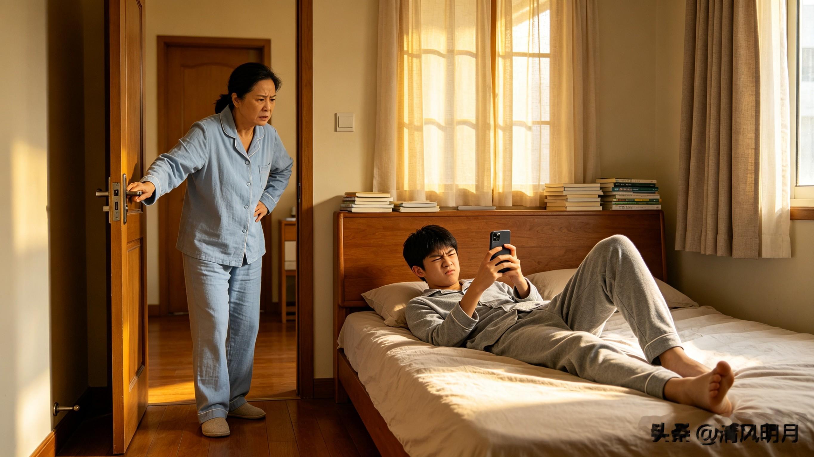 妈妈推开14岁儿子小轩的房门,发现他还缩在被窝里刷手机。