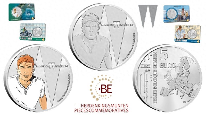 纪念币设计该纪念币由荷兰皇家造币厂在荷兰豪滕的工厂生产,获比利时皇家造币厂授权,并代表比利时财政部发行。两款纪念币正面均大胆描绘了这位冒险亿万富翁的肖像,位于硬币左半部分。背景为系列标志,一个风格化的宽体“W”以及“LARGO WINCH”字样。